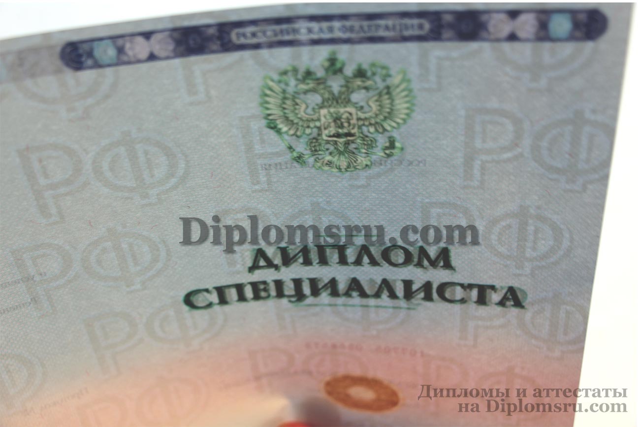 Данная степень защиты диплома государственного образца представляет собой элементы бланка, видимые на просвет (при заднем освещении). На фото (кликните для увеличения) Вы сможете рассмотреть водяные знаки с надписью РФ, которые расположены на всей поверхности бланка.